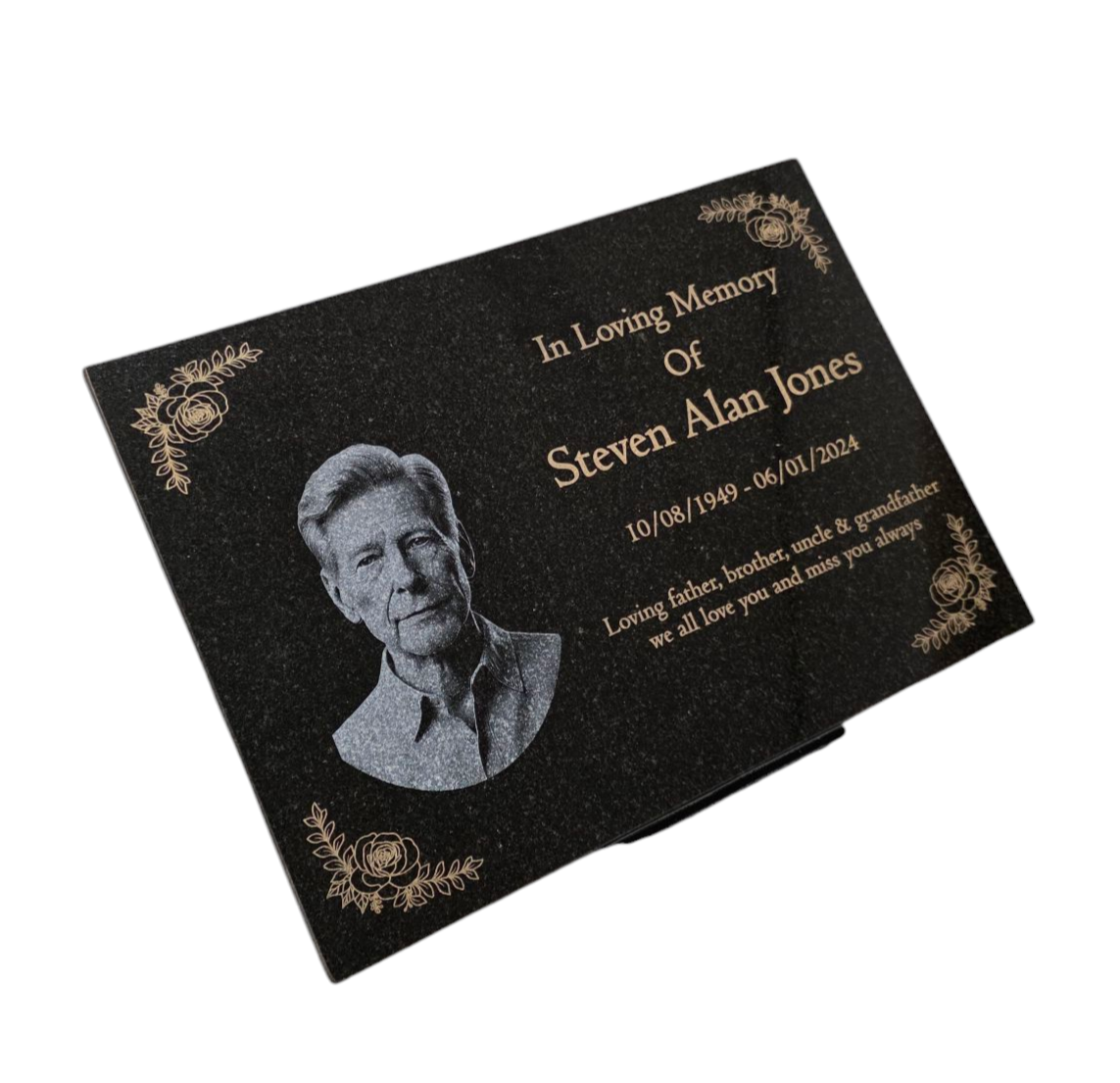 Granite Memorial Plaque, Flowers, Add a Portrait, Personalised Text and Stand Included